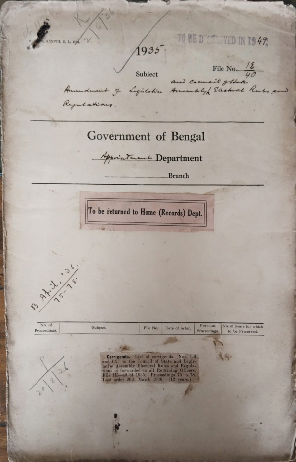 | Rack No. 2, Bundle No. 30, Sl No. 1755 Expenditure incurred by the corporation of Calcutta. | Rack No. 2, Bundle No. 30, Sl No. 1756 Proposed confirmation of Certain provincial Judicial service officers in listed posts of District & Sessionion Judge. | Rack No. 2, Bundle No. 30, Sl No. 1757 Standardization of the forms prescribed in the Ecclesiastical Rules, 1932. | Rack No. 2, Bundle No. 30, Sl No. 1758 Amendment of legislative Assembly Electoral Roils and Regulations. | Rack No. 2, Bundle No. 30, Sl No. 1759 Proposal that Treatment of railway receipts. | Rack No. 2, Bundle No. 30, Sl No. 1760 Storage of percussion Presses. | Rack No. 2, Bundle No. 6, Sl No. 301 Confirmation of a B.C.S. (Executive) officer in a listed port. |