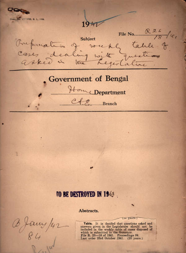 | Rack No. 08, Bundle No. 18; SI No. 1157 Character roll of assist revised and included in the Secretarial manual. | Rack No. 08, Bundle No. 18; SI No. 1158 Proposal for amendment of rules 17 of the revised Darjeeling Code. | Rack No. 08, Bundle No. 18; SI No. 1159 Procedure to be observed in-dealing with application for the removal of disqualifications. | Rack No. 08, Bundle No. 18; SI No. 1160 Preparation of weekly table of cases disposed with questions asked in the Legislature. | Rack No. 08, Bundle No. 19; SI No. 1161 Secretary ship of the Forest and Excise Department. | Rack No. 08, Bundle No. 19; SI No. 1162 Putting of Supplementary questions in the Bengal Legislative Assembly. | Rack No. 08, Bundle No. 19; SI No. 1163 Allotment of funds for expenditure in connections with by elections in the Dacca Division Non-Muhammadan Constituency of the Indian Legislative Assembly. |