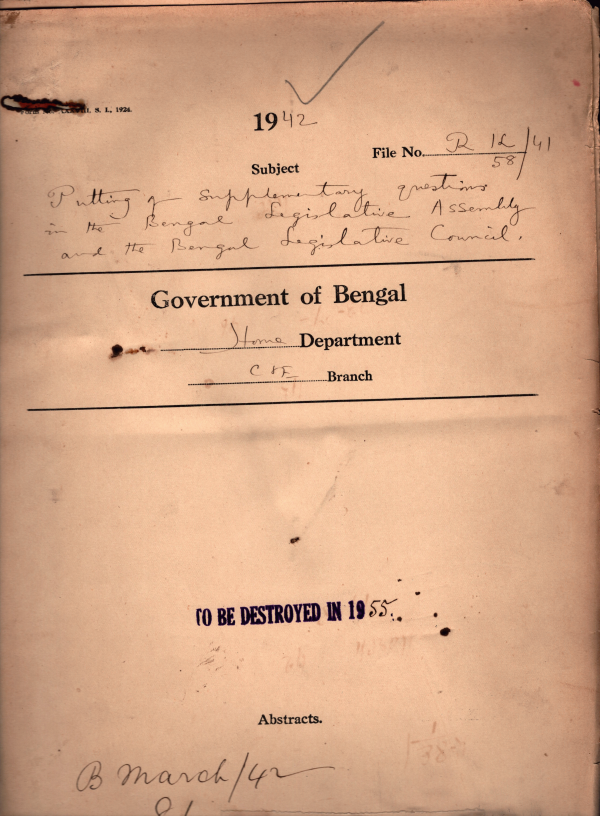 | Rack No. 08, Bundle No. 18; SI No. 1159 Procedure to be observed in-dealing with application for the removal of disqualifications. | Rack No. 08, Bundle No. 18; SI No. 1160 Preparation of weekly table of cases disposed with questions asked in the Legislature. | Rack No. 08, Bundle No. 19; SI No. 1161 Secretary ship of the Forest and Excise Department. | Rack No. 08, Bundle No. 19; SI No. 1162 Putting of Supplementary questions in the Bengal Legislative Assembly. | Rack No. 08, Bundle No. 19; SI No. 1163 Allotment of funds for expenditure in connections with by elections in the Dacca Division Non-Muhammadan Constituency of the Indian Legislative Assembly. | Rack No. 08, Bundle No. 19; SI No. 1164 Shifting of the telephone in the room of the Registrar, Bengal Legislative Council. | Rack No. 08, Bundle No. 19; SI No. 1165 Appointment of revising officers to dispose of Claims and objections to the drat electoral rolls of certain constituencies of the provincial Legislature |