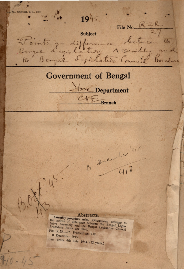 | Rack No. 08, Bundle No. 26, SI No. 1674 Recovery of costs incurred in connection with elections to the Central legislature, 1943-44. | Rack No. 08, Bundle No. 26, SI No. 1675 Commitments made on assurances given by an Honorable Minister on the floor of the legislature. | Rack No. 08, Bundle No. 26, SI No. 1676 Note for Revising Authority. | Rack No. 08, Bundle No. 26, SI No. 1677 Points of difference between the B.L.A. and B.L.C. procedure. | Rack No. 08, Bundle No. 26, SI No. 1678 Appointment of Stenographers and other staff for parliamentary Secretaries. | Rack No. 08, Bundle No. 26, SI No. 1679 Deputation of two C.I.D. Reporters to report the proceedings of the B.L.A. | Rack No. 08, Bundle No. 26, SI No. 1680 Creation of Co-ordination Committee of Council and its Secretariat. |