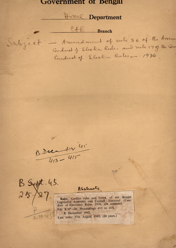| Rack No. 08, Bundle No. 26, SI No. 1688 Assent of H/E the Governor General to the Bengal Slum Improvement Bill, 1945. | Rack No. 08, Bundle No. 26, SI No. 1689 Supply of Certain information’s to S.I.B. in connection with the Dacca University Convocation Speech by H/E. | Rack No. 08, Bundle No. 26, SI No. 1690 Supply to the new Ministers Copies of memorandum regarding retention by member of the Council of Ministers. | Rack No. 08, Bundle No. 26, SI No. 1691 Amendment of rule 36 of the Assembly Conduct of Election Rules. | Rack No. 08, Bundle No. 26, SI No. 1692 Competency of Deputy President to authenticate Bills | Rack No. 08, Bundle No. 26, SI No. 1693 Assent of the governor to the Bengal Public Gambling Bill 1945. | Rack No. 08, Bundle No. 26, SI No. 1694 Assent of H/E the governor general to the Coronas and Criminal procedure Bill, 1944. |