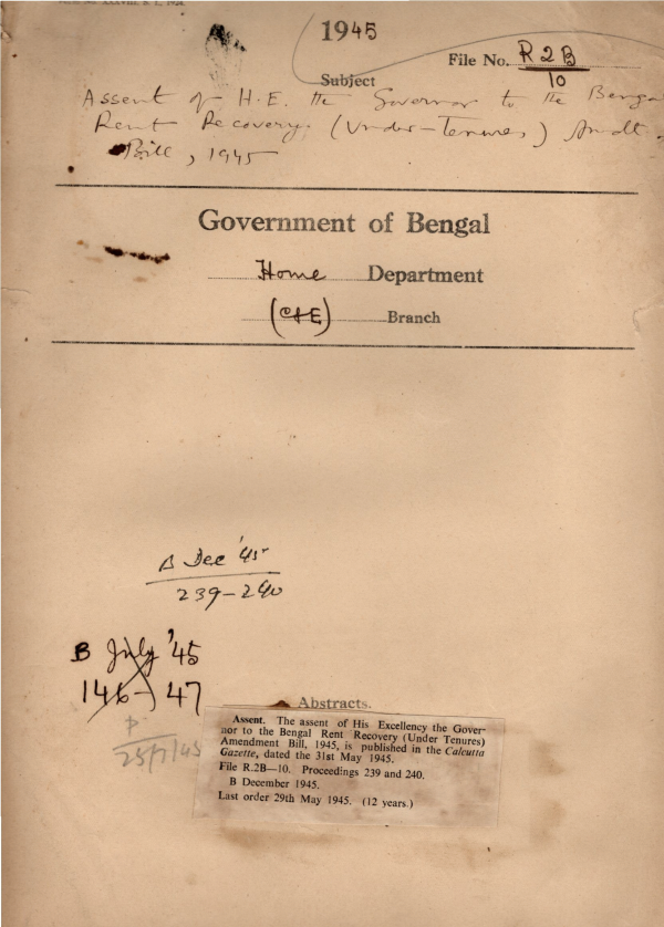 Assent of H/E the governor to the Bengal Rent Recovery Amendment Bill, 1945.