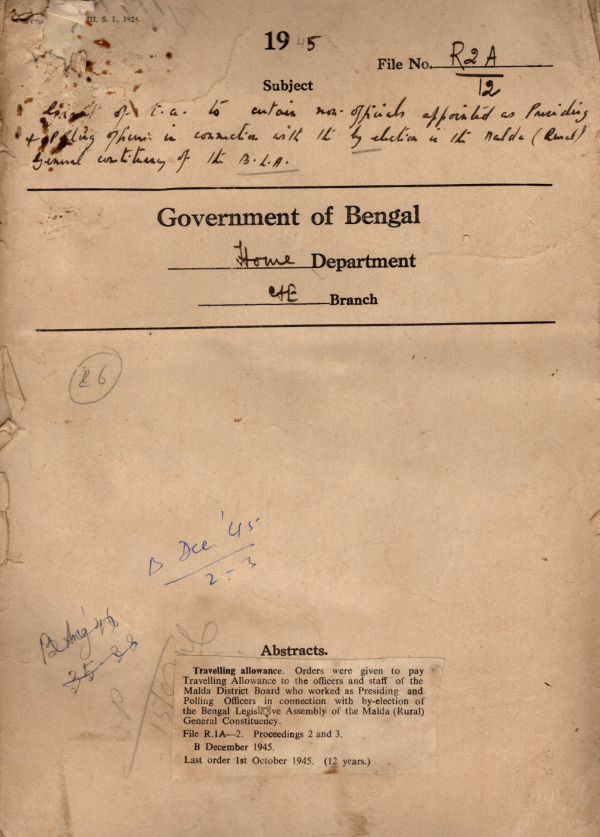 | Rack No. 08, Bundle No. 26, SI No. 1701 Memorandum Showing which of the new Schemes included in the Budget for 1943-44. | Rack No. 08, Bundle No. 26, SI No. 1702 Assent of H/E the governor to the Bengal Destitute persons Extending Bill, 1945. | Rack No. 08, Bundle No. 26, SI No. 1703 Application under rule 9(B) of the legislative Assembly Electoral Rules. | Rack No. 08, Bundle No. 26, SI No. 1704 Grant of T.A. to Certain non-officials’ staff of the Malda District Board worked by election of the B.L.A. | Rack No. 08, Bundle No. 26, SI No. 1705 Mr. Galvin’s note on government publicity in Bengal | Rack No. 08, Bundle No. 26, SI No. 1706 Payment of Bills on account of Trunk Calls made by the Parliamentary Secretaries. | Rack No. 08, Bundle No. 26, SI No. 1707 Last pay certificates and service Records of Certain Stenographers of the Parliamentary Secretaries. |