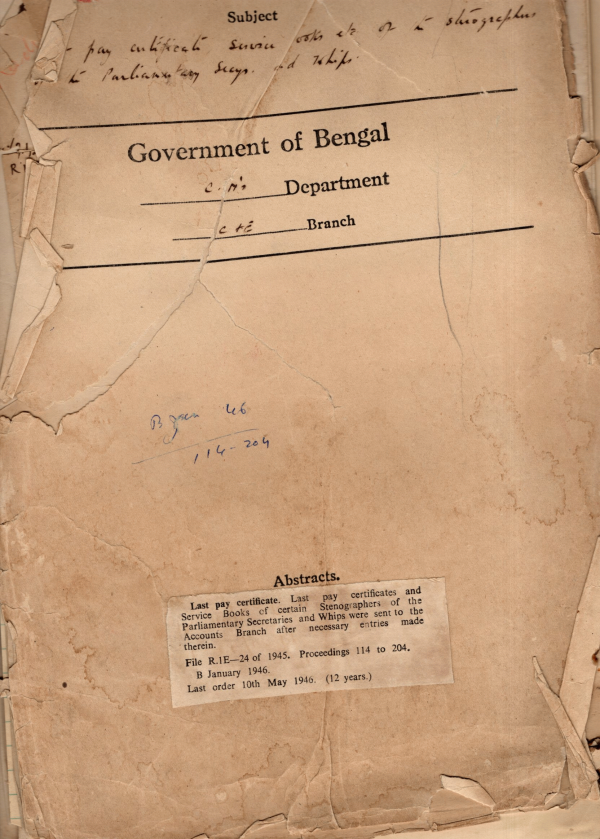 | Rack No. 08, Bundle No. 26, SI No. 1704 Grant of T.A. to Certain non-officials’ staff of the Malda District Board worked by election of the B.L.A. | Rack No. 08, Bundle No. 26, SI No. 1705 Mr. Galvin’s note on government publicity in Bengal | Rack No. 08, Bundle No. 26, SI No. 1706 Payment of Bills on account of Trunk Calls made by the Parliamentary Secretaries. | Rack No. 08, Bundle No. 26, SI No. 1707 Last pay certificates and service Records of Certain Stenographers of the Parliamentary Secretaries. | Rack No. 08, Bundle No. 26, SI No. 1708 Assent of H/E the governor to the Bengal Finance Second Amendment Bill, 1946. | Rack No. 08, Bundle No. 26, SI No. 1709 The Albert Victor Lepar Hospital (Amendment) Bill, 1944. | Rack No. 08, Bundle No. 26, SI No. 1710 Revised procedure for the Circulation of printed Copies of opinions on bills. |