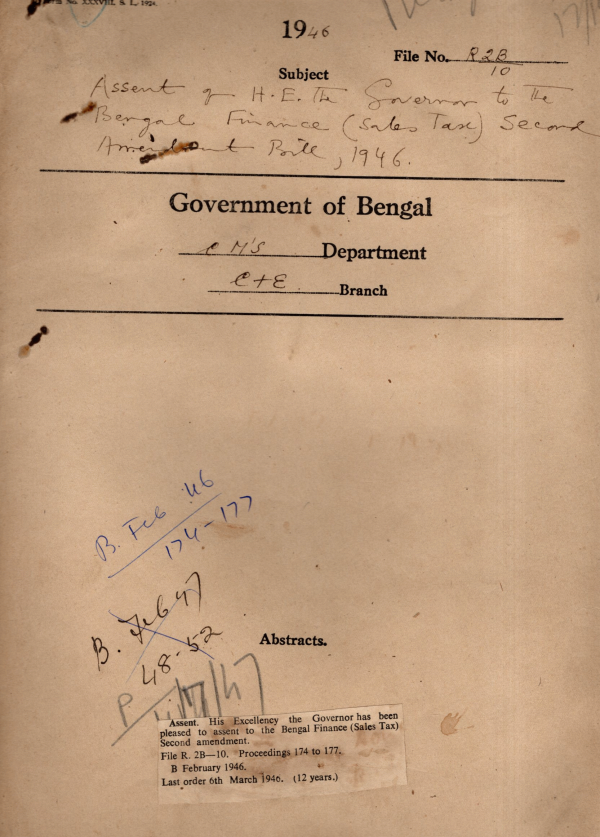 Assent of H/E the governor to the Bengal Finance Second Amendment Bill, 1946.