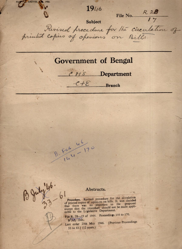 | Rack No. 08, Bundle No. 26, SI No. 1707 Last pay certificates and service Records of Certain Stenographers of the Parliamentary Secretaries. | Rack No. 08, Bundle No. 26, SI No. 1708 Assent of H/E the governor to the Bengal Finance Second Amendment Bill, 1946. | Rack No. 08, Bundle No. 26, SI No. 1709 The Albert Victor Lepar Hospital (Amendment) Bill, 1944. | Rack No. 08, Bundle No. 26, SI No. 1710 Revised procedure for the Circulation of printed Copies of opinions on bills. | Rack No. 08, Bundle No. 26, SI No. 1711 General elections to the Indian Legislative Assembly. | Rack No. 08, Bundle No. 26, SI No. 1712 Expansion of the Cabinet allotment of portfolios to new ministers. | Rack No. 2, Bundle No. 01, Sl No. 01 Provision of Pipe water connection in the Chaplain's residence, Dacca. |